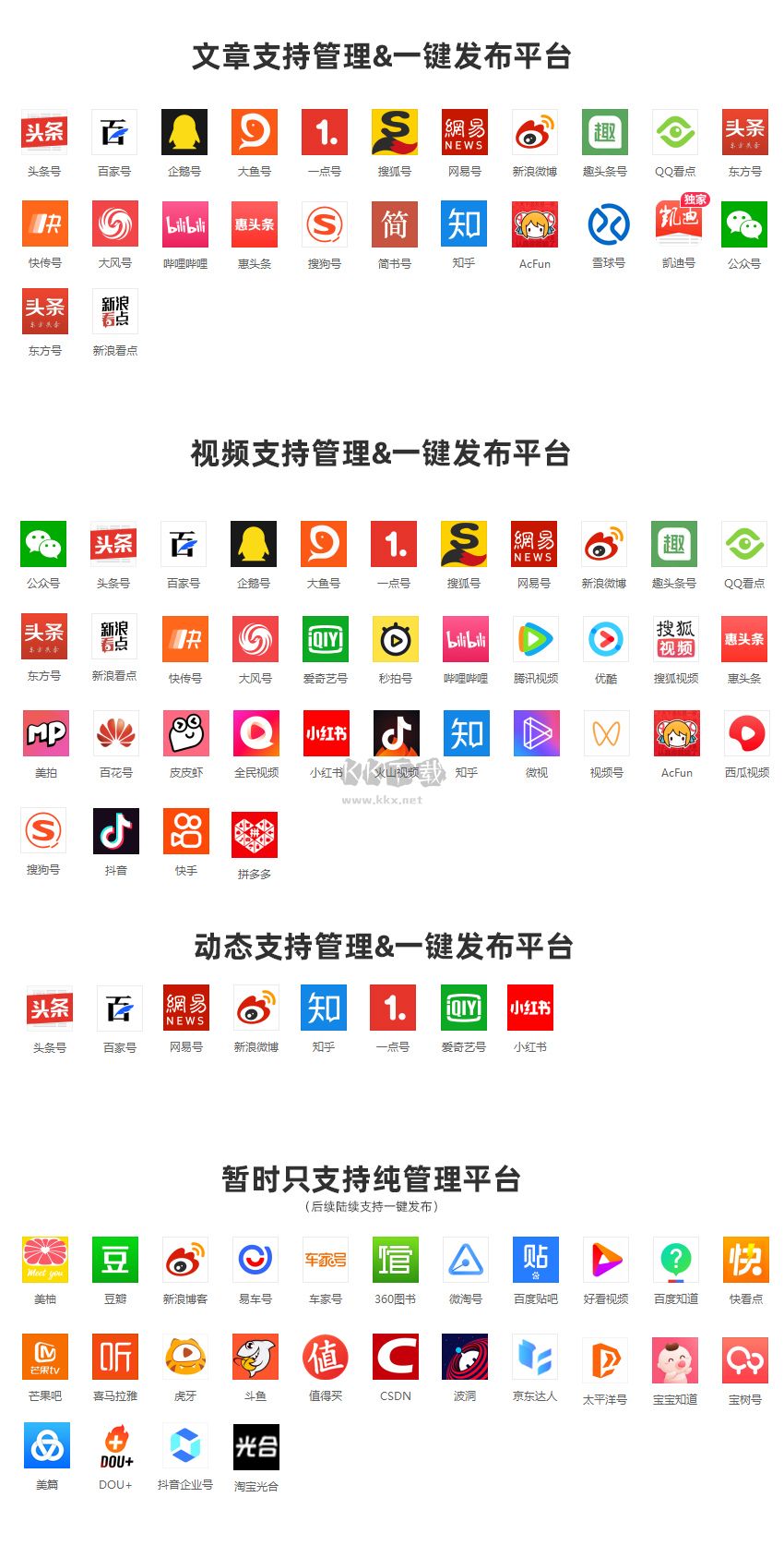 易媒助手截止2022年6月,支持近70+平臺,新平臺新功能持續(xù)開發(fā)中,現(xiàn)支持平臺如下所示