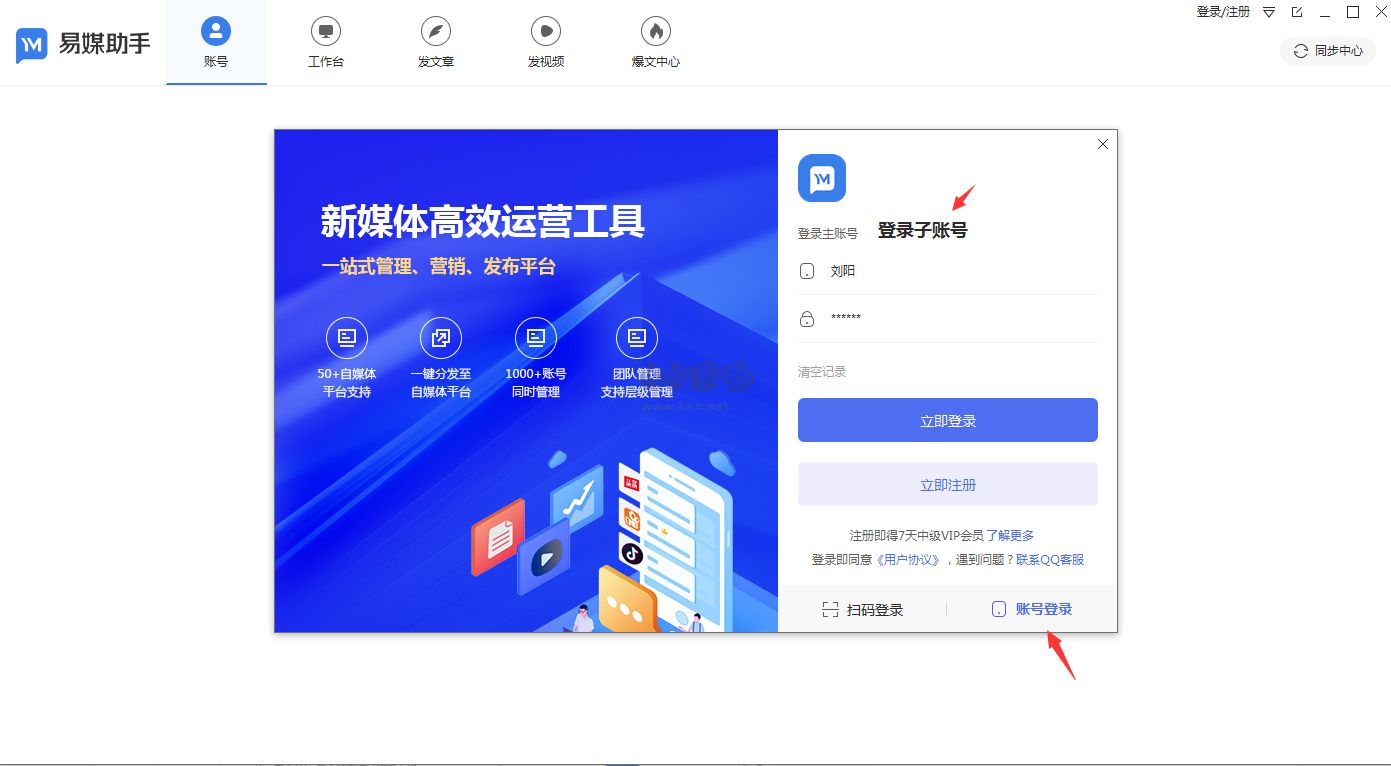 在易媒助手登錄界面,選擇主賬號創(chuàng)建的子賬號登錄即可