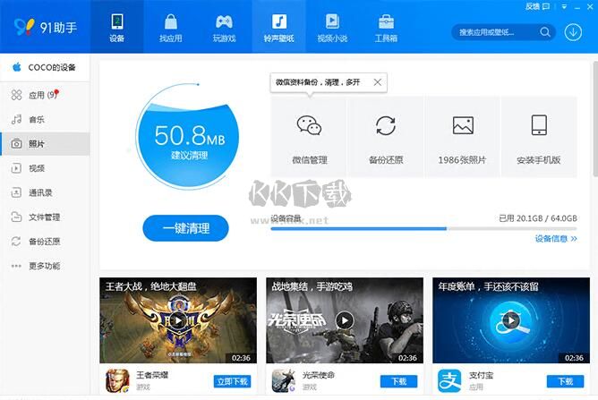 91助手PC版是一款專門為iPhone、iPad、Android等智能電子設(shè)備進(jìn)行管理的軟件,鏈接上設(shè)備就能下載應(yīng)用、游戲、資源到手機(jī)中,還能備份出手機(jī)的數(shù)據(jù),還原損壞的手機(jī)系統(tǒng),比在手機(jī)上操作簡單多了,感興趣的朋友速速下載體驗(yàn)吧!