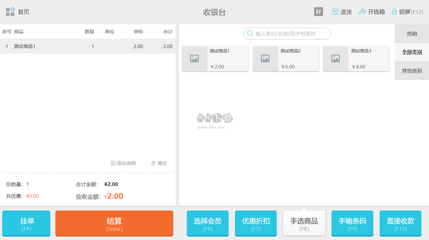 進入收銀臺界面,首先選擇商品(可通過掃碼槍掃碼添加,或在右側(cè)手選添加),選擇好之后,點擊“結(jié)算”,進入收銀界面。選擇收款方式,輸入收款金額,點擊完成即可。
