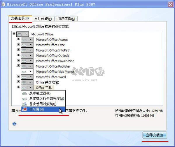 1、安裝選項(xiàng)(見圖二):可手動(dòng)選擇要安裝office的組件,點(diǎn)擊鼠標(biāo)左鍵即可進(jìn)行選擇。