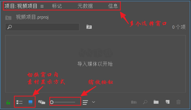 項(xiàng)目窗口主要用于導(dǎo)入、存放和管理素材。編輯影片所用的全部素材應(yīng)事先存放于項(xiàng)目窗口內(nèi),再進(jìn)行編輯使用。項(xiàng)目窗口的素材可用列表和圖標(biāo)兩種視圖方式顯示,包括素材的縮略圖、名稱、格式、出入點(diǎn)等信息。在素材較多時(shí),也可為素材分類、重命名,使之更清晰。