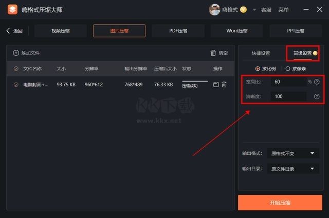 3、最后點(diǎn)擊右下角的【開(kāi)始?jí)嚎s】按鈕,稍等片刻照片大小就被壓縮成功啦,比如下面這個(gè)原本93.75KB的照片,被輕松壓縮到了48.98KB。