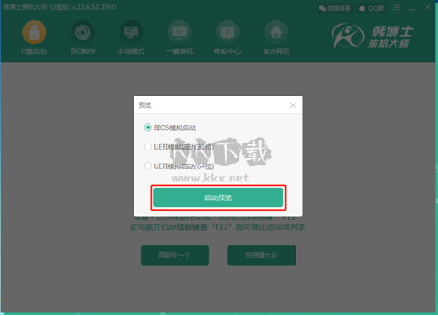 選擇“啟動(dòng)預(yù)覽”,韓博士裝機(jī)大師會(huì)進(jìn)行模擬啟動(dòng)。出現(xiàn)韓博士U盤系統(tǒng)維護(hù)工具界面,說明U盤的制作成功。
