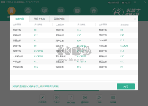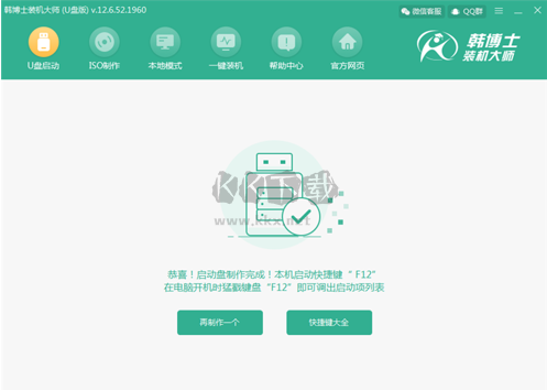第八步:U盤啟動(dòng)盤制作完成后,軟件會(huì)提示啟動(dòng)快捷鍵是哪個(gè)按鍵,按此鍵可通過設(shè)置U盤為第一啟動(dòng)項(xiàng),然后進(jìn)入韓博士PE系統(tǒng)。