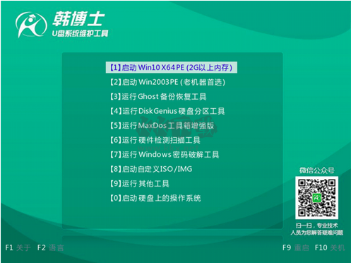 2.點(diǎn)擊USB選項(xiàng)后,接著會(huì)彈出韓博士PE菜單選項(xiàng)的界面,一般選擇“【01】啟動(dòng)Win10X64PE(2G以上內(nèi)存)”回車鍵確定即可。