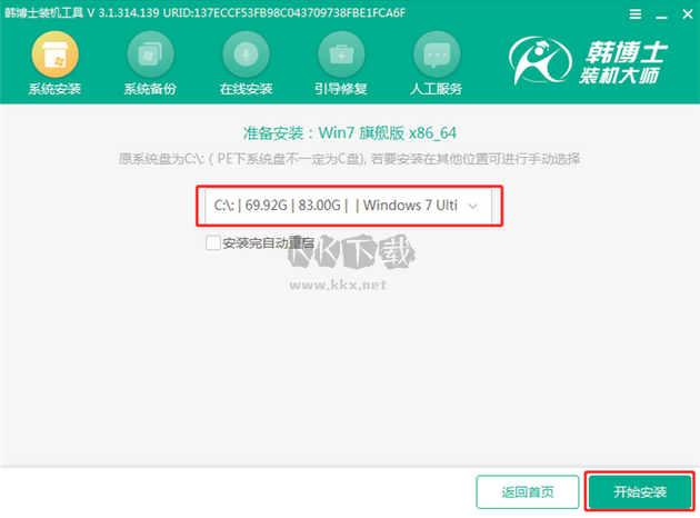 3.進(jìn)入PE界面后自動(dòng)彈出韓博士裝機(jī)工具,勾選U盤內(nèi)的“win7旗艦版”系統(tǒng),也可選擇自行下載的系統(tǒng)文件。點(diǎn)擊“安裝”;
