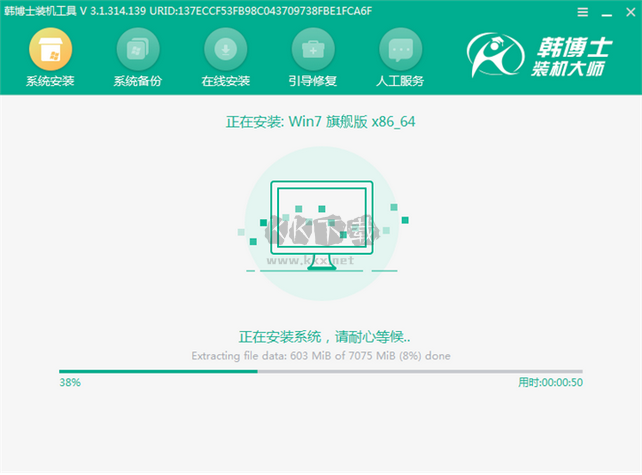 5.進(jìn)入安裝系統(tǒng)的狀態(tài)。韓博士裝機(jī)工具會(huì)幫你全自動(dòng)安裝,安裝過程中請(qǐng)保持通電正常,不要斷電或者關(guān)機(jī);