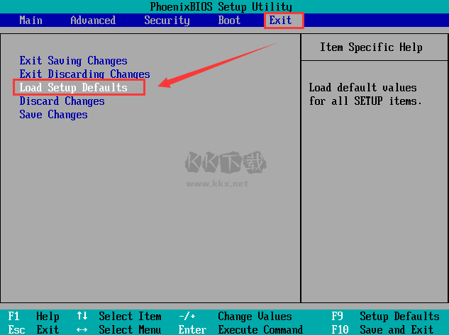 第一步:進入BIOS設置后,將選項卡切換至“Exit”,再按“↑”“↓”方向鍵選擇到“Load Setup Dwfaults”。如圖所示: