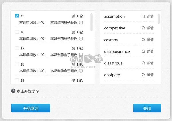 8、同一課程分別學(xué)習(xí)完白、黃、綠、藍盒子之后,單詞記憶的四個過程全部進行完畢,學(xué)習(xí)后的單詞進入紫色盒子中,這里面的單詞是已經(jīng)熟練掌握的,你可以打開成績單看看自己的學(xué)習(xí)成績。如果想再次學(xué)習(xí),還可以在紫盒子里再次點擊課程,重新進入4個階段的循環(huán)學(xué)習(xí)過程中。