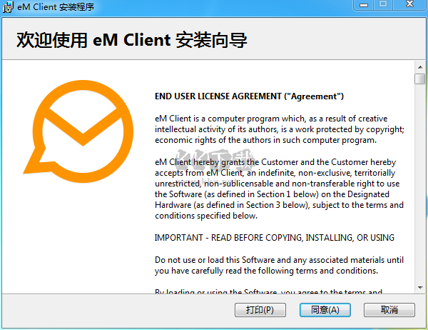 1、下載eM Client安裝程序,進入安裝向?qū)?,點擊“同意”
