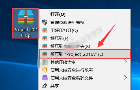 1.選中【Project_2016】壓縮包,鼠標(biāo)右擊選擇【解壓到Project_2016】。