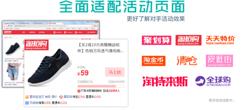 2、數(shù)據(jù)顯示網(wǎng)站:淘寶天貓的搜索列表、寶貝詳情頁、店鋪寶貝列表、聚劃算、淘金幣、清倉、淘搶購、天天特價、折800、淘粉吧、51返利網(wǎng)、眾劃算、卷皮網(wǎng)等