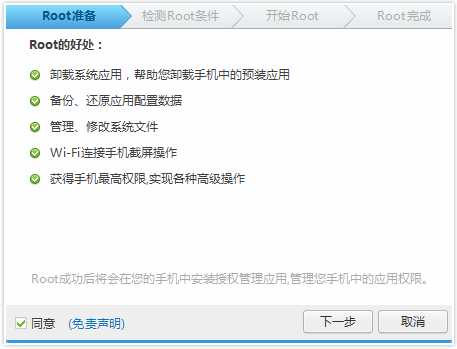 第二步:點(diǎn)擊一鍵Root,勾選同意《免責(zé)聲明》點(diǎn)擊下一步。