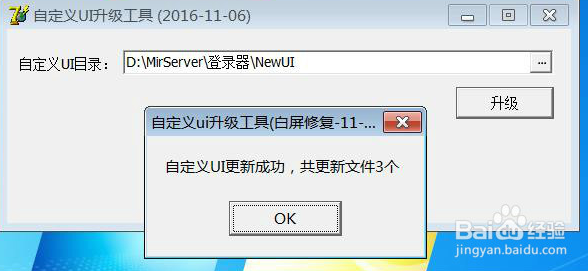 第三步:先升級一下UI,也就是打開自定義UI升級工具(白屏修復),進行升級,那么什么情況下要升級呢?要在登錄器文件夾內可以看到NewUI這個文件,點擊進去,如果里面有大量的Bak格式的文件,那么必須升級,沒有升級進入游戲會出現(xiàn)白屏,特別是升級了引擎。這一步少不了,逃不掉。
