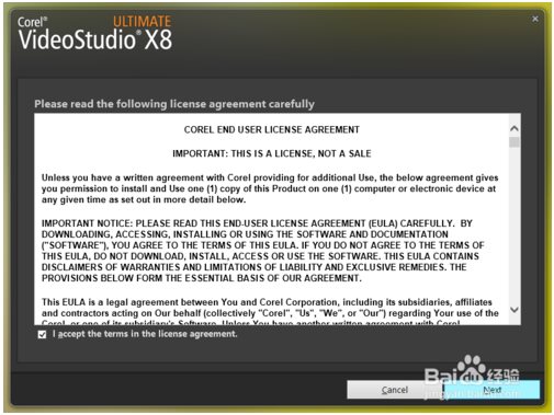 1、進(jìn)入會(huì)聲會(huì)影X8官網(wǎng),下載安裝程序并打開,勾選【I accept the terms in the license agreement】,然后點(diǎn)擊【Next】