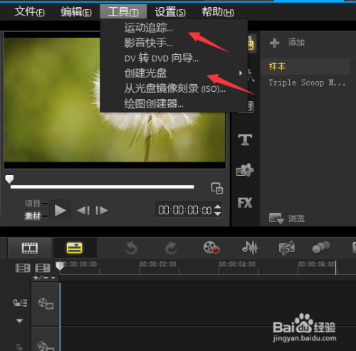 點(diǎn)擊工具菜單,在工具菜單里我們就可以使用運(yùn)動(dòng)追蹤,,也可以創(chuàng)建光盤,如圖所示:
