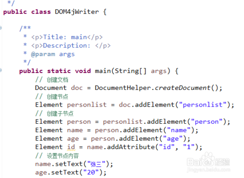 下面我們來完成寫XML文件的操作,和之前介紹的其他解析XML文件的工具一樣,我們首先需要創(chuàng)建文檔,然后定義各個節(jié)點(diǎn)和子節(jié)點(diǎn)。如下圖所示,我們可以看出使用DOM4J操作非常的簡單,在創(chuàng)建節(jié)點(diǎn)的時候便建立了節(jié)點(diǎn)之間的關(guān)系,其他的解析工具不能一步完成,然后給各個節(jié)點(diǎn)設(shè)置內(nèi)容。