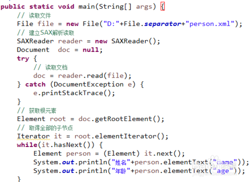 接著我們來實(shí)現(xiàn)讀取以上步驟中創(chuàng)建的XML文件,DOM4J同樣使用SAX建立解析器,然后通過文檔依次找到根節(jié)點(diǎn),再通過根節(jié)點(diǎn)找到每一個節(jié)點(diǎn)的內(nèi)容,最后打印輸出每個節(jié)點(diǎn)的內(nèi)容。