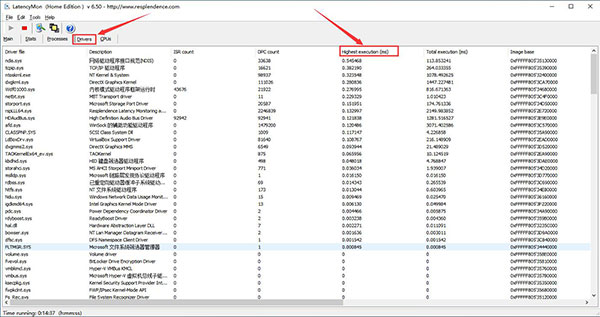2、通過對(duì)最高執(zhí)行時(shí)間列進(jìn)行排序,您可以看到導(dǎo)致延遲問題的所有驅(qū)動(dòng)程序。