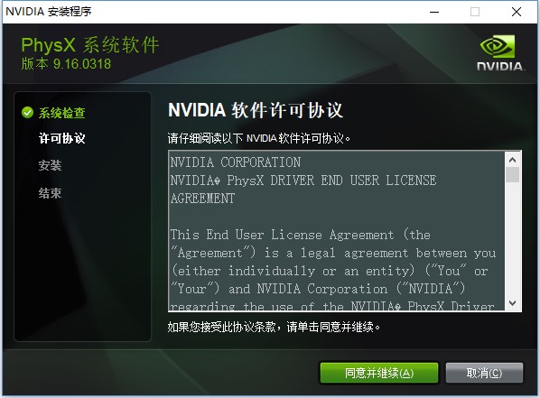 1、等待NVIDIA PhysX下載完成,解壓縮并雙擊exe文件進(jìn)入安裝向?qū)Вc(diǎn)擊同意并繼續(xù)