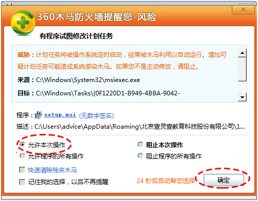 電腦安裝的殺毒軟件,或者防火墻,可能會提示您如下風(fēng)險。此時需要允許程序進行安裝。以360為例,點擊允許本次操作,點擊確定。否則會安裝失敗。