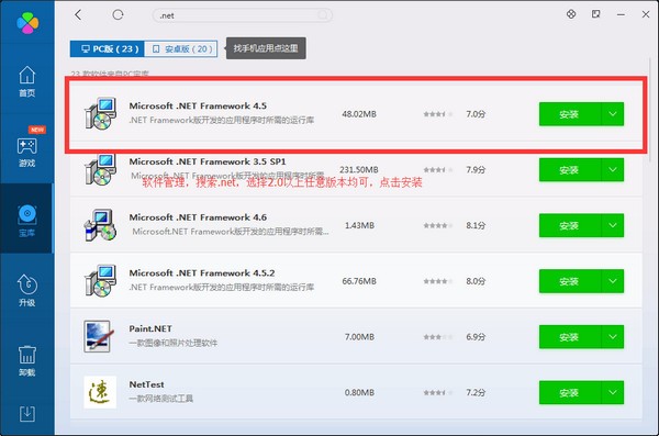 如果提示要安裝.net2.0,用電腦管家之類的軟件裝一下,見下圖所示: