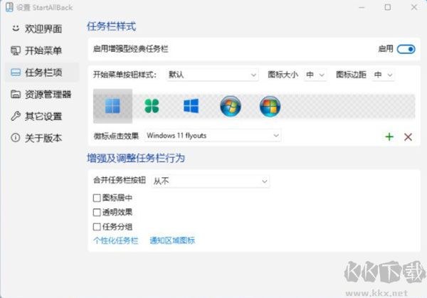 在StartAllBack中,任務(wù)欄的風格整體是跟隨開始菜單樣式,但它也支持自由設(shè)定,主要包括兩個方面:外觀與行為。