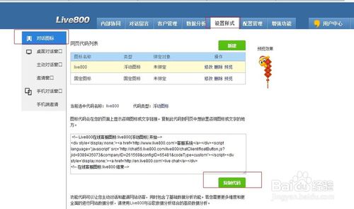 配置管理-設(shè)置樣式-對話圖標(biāo),將對應(yīng)網(wǎng)頁代碼的圖標(biāo)代碼及功能代碼按照后面的操作提示復(fù)制到您網(wǎng)站源代碼中; 分別為:將圖標(biāo)代碼復(fù)制到網(wǎng)頁中您想放置Live800圖標(biāo)或文字的地方;將功能代碼復(fù)制到網(wǎng)頁代碼中最后一個</body> 前。 當(dāng)訪客訪問您的網(wǎng)站時,只需點擊這個咨詢圖標(biāo),就可與客服進行實時交流。