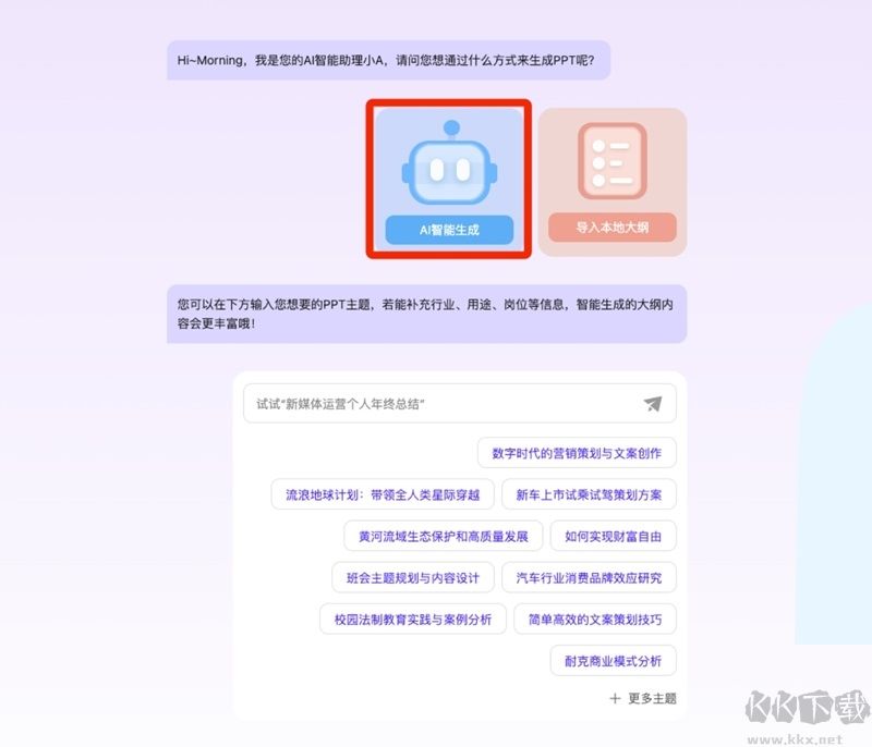 AiPPT電腦版是一款PPT在線生成軟件,這款軟件下載起來(lái)非常的簡(jiǎn)單,不需要復(fù)雜的操作,只需一鍵就能生成高質(zhì)量 得PPT,并且還能支持用戶在線自定義編輯和文檔導(dǎo)入生成,還能快速提升工作的效率,為用戶省下不少構(gòu)思內(nèi)容的時(shí)間,感興趣或者有需要的小伙伴就快來(lái)kk網(wǎng)站下載體驗(yàn)一下吧。