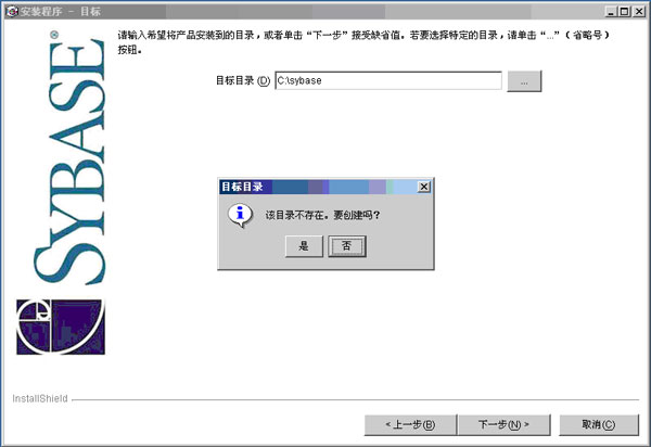 6、點(diǎn)擊“下一步”安裝的時(shí)候提示不存在該目錄,問是否要?jiǎng)?chuàng)建“sybase”安裝目錄。你只點(diǎn)擊“是”,就可以自動(dòng)創(chuàng)建“sybase”目錄,如下圖: