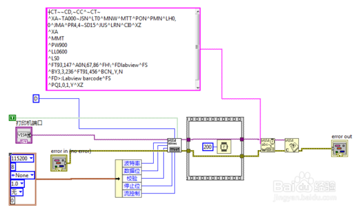 復(fù)制PRN文件中的文本內(nèi)容,在labview中創(chuàng)建如圖所示的程序框圖,將復(fù)制的文本內(nèi)容粘貼在字符串常量中,選擇打印機的串口,運行該VI就能打印出我們需要的標簽了。