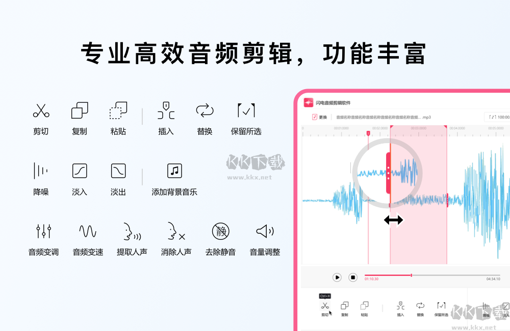 閃電音頻剪輯軟件電腦版是一款非常好用的音頻后期處理軟件,這款軟件非常的實(shí)用,用戶(hù)能夠利用這款軟件對(duì)音頻文件進(jìn)行剪切,合并等操作,用戶(hù)還能通過(guò)這款軟件提升音頻的聲音質(zhì)感,滿(mǎn)足不同用戶(hù)的編輯需求,感興趣或者有需要的小伙伴就快來(lái)kk網(wǎng)站下載體驗(yàn)一下吧。