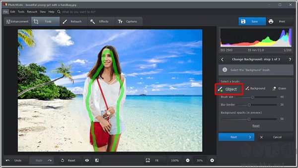 該程序?qū)⒆屇褂镁G色畫(huà)筆在前景上標(biāo)記對(duì)象。調(diào)整畫(huà)筆大小并標(biāo)記對(duì)象或人。你不必仔細(xì)地把所有東西都涂上。只需畫(huà)幾筆,PhotoWorks 就會(huì)自動(dòng)確定邊緣