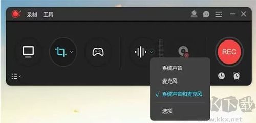 點擊聲音按鈕來選擇是否錄制聲音,在下拉列表中,有三種模式可選,“系統(tǒng)聲音”、“麥克風”和“系統(tǒng)聲音和麥克風”,按需選擇正確的音源。同時,你可以在“選項”中調(diào)節(jié)系統(tǒng)聲音和麥克風的音量。