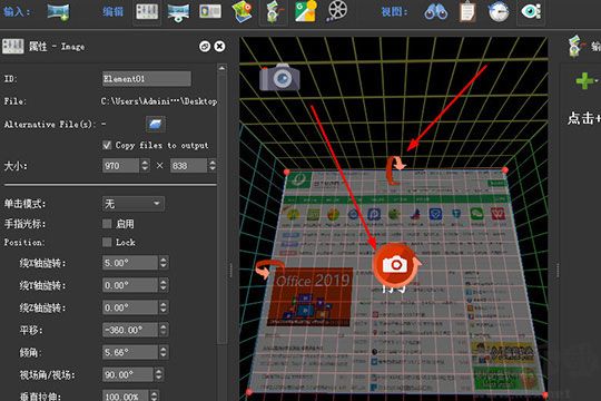 3、成功添加圖片后,用戶可以調(diào)整視角,從而讓你更加方便的進行調(diào)節(jié)圖片,選中中間的按鈕即可拖動圖片,你還可以根據(jù)自己的需要調(diào)節(jié)圖片的大小與角度;如果你想要精準調(diào)節(jié)其中的數(shù)值,只需要在左邊的屬性中輸入數(shù)值即可,不管是大小、旋轉(zhuǎn)角度還是平移等內(nèi)容,都可以自定義輕松調(diào)節(jié),如下圖所示:
