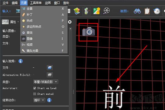 1、首先需要先進入到Pano2VR軟件內(nèi),由于軟件默認是不存在任何圖像的,所以如果你想要制作全景圖,則需要自己添加圖片才行,用戶可以在上方欄目中找到“元素”,點擊其中的“圖像”功能,當紅框標注內(nèi)的地方出現(xiàn)圖像標志時,點擊其中的“前”字樣開始圖像的添加,如下圖所示: