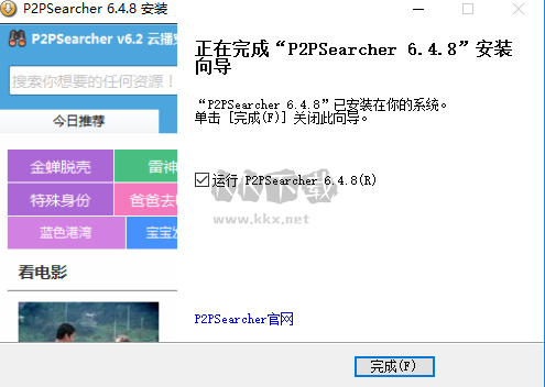 五、P2pSearcher綠色版安裝完畢會(huì)提示,點(diǎn)擊【完成】就可以運(yùn)行軟件啦