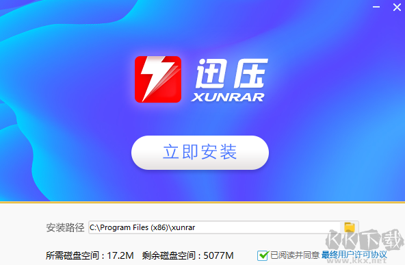 1.在kk網(wǎng)站下載迅壓官方包,雙擊打開,進入軟件界面,點擊“立即安裝”
