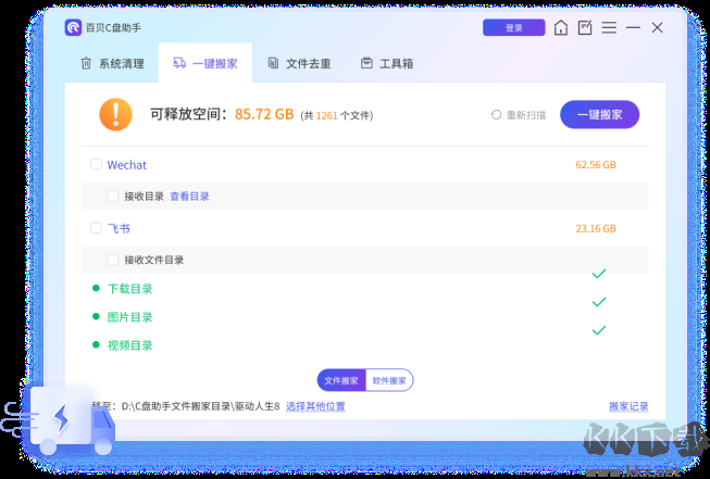 2、支持安裝包、企業(yè)微信、壓縮包和日志文件等多種文件及升級目錄,一鍵即可搬家亦可還原搬家路徑和查詢搬家記錄,省心無憂。