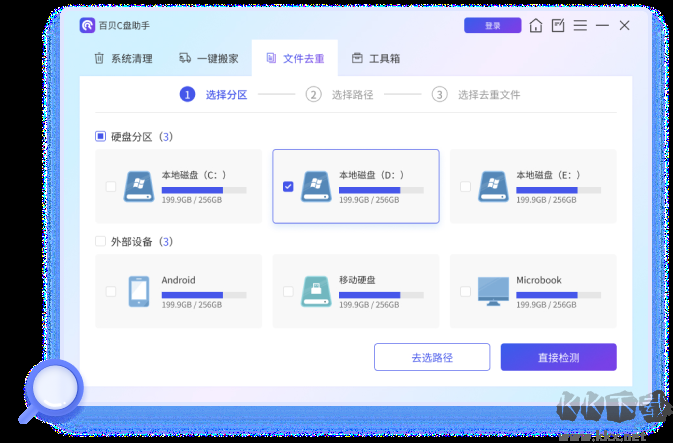 3、自由選擇檢測路徑,節(jié)省您寶貴時間。百貝C盤助手支持本地磁盤文件去重的同時,更支持外部設(shè)備和常用目錄下的檢測。