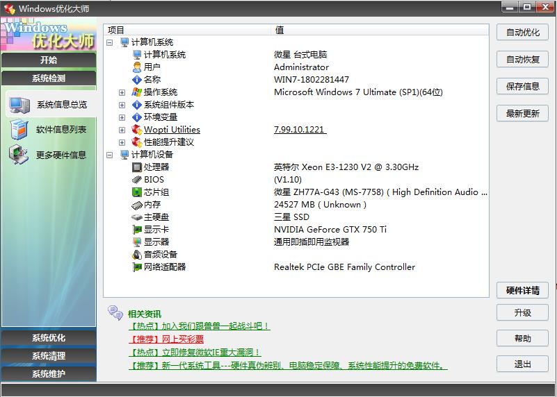 1、系統(tǒng)信息總覽可快速查看操作系統(tǒng)信息、準確的硬件、軟件信息、系統(tǒng)組件版本、環(huán)境變量等,并可根據(jù)計算機信息提供優(yōu)化建議;