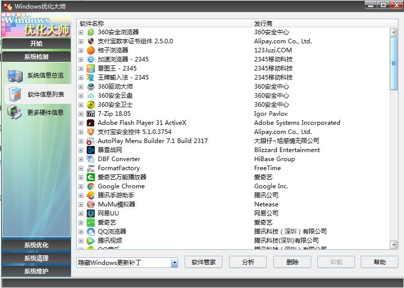 2、軟件信息列表可快速查看當前系統(tǒng)中安裝的所有軟件、Windows補丁,并提供分析無效項目、卸載、刪除等多個功能選項;