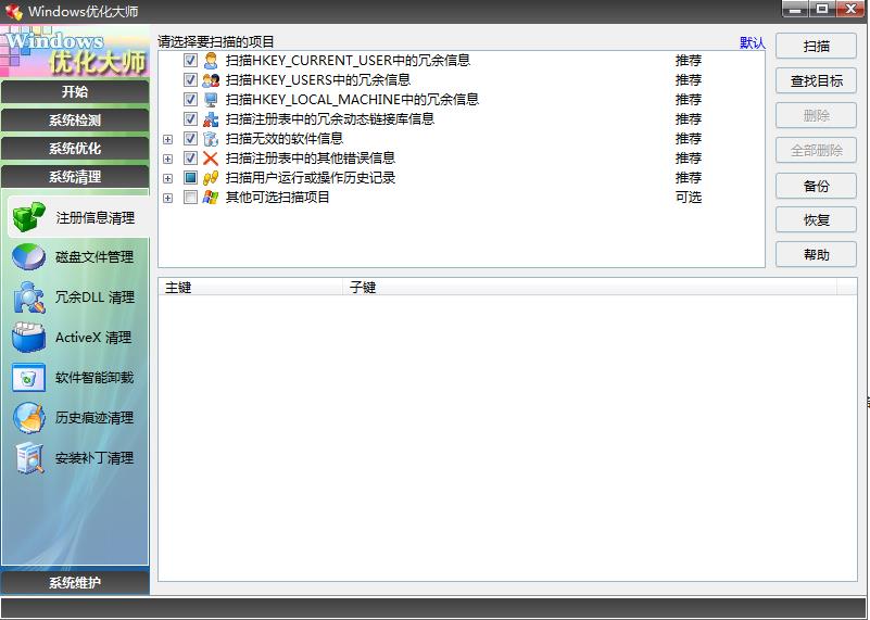 (7)、備份恢復管理:所有被清理刪除的項目均可從Windows優(yōu)化大師自帶的備份與恢復管理器中進行恢復。