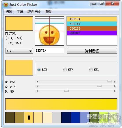 Just Color Picker中文版是一款非常小巧的屏幕取色軟件,在我們平時(shí)設(shè)計(jì)、作圖時(shí)非常有用,只要把鼠標(biāo)放在屏幕的任何一處,就可以獲取顏色代碼。同時(shí)下方也會(huì)給出一些參考顏色方案。