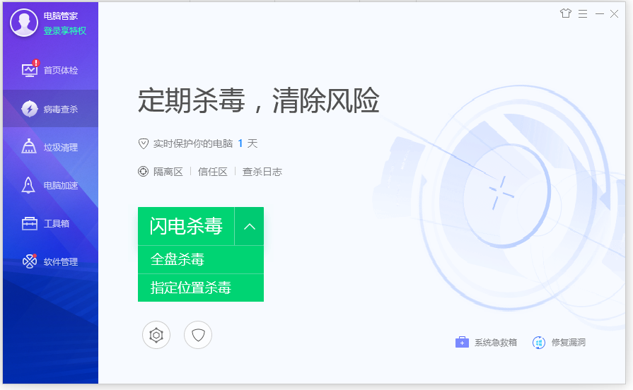 點擊【病毒查殺】——【閃電殺毒】,選擇【全盤殺毒】或者【指定位置殺毒】,可以掃描計算機系統(tǒng),及時發(fā)現(xiàn)病毒并進行清理