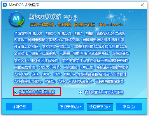 下載MaxDOS工具箱,解壓壓縮包,雙擊.exe文件,閱讀許可協(xié)議,選擇同意,