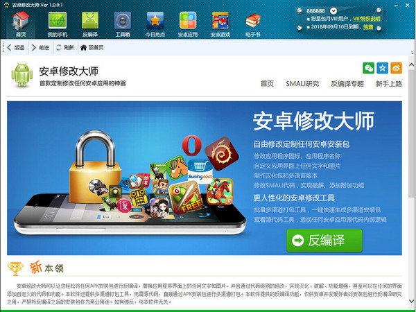 1.反編譯安卓APK應用:輕松破譯未經(jīng)加固的APK安裝包,可修改應用程序圖標和應用程序名稱,替換應用任何文字和圖片,并進行漢化和翻譯,更支持通過先進的SMALI代碼,對應用程序進行破解,加強。