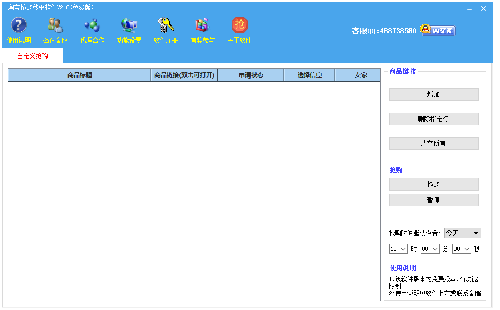聚劃算搶購秒殺軟件是一款非常易用、 快速搶拍的一款搶購軟件,軟件只需要設(shè)置好需要搶購的商品鏈接以及商品的選擇參數(shù),比如顏色、尺碼等就可以完成整點搶購,無需人為等待整點進行搶購,而且往往人為搶購根本搶購不到,而軟件-旦檢測到整點會立即快速搶拍,大大提高了搶購成功率而且還節(jié)約了您的寶貴時間,省時省力,軟件是全后臺搶購操作,- 旦設(shè)置好商品參數(shù), 點擊搶購即可最小化窗口,不影響您工作。需要在淘寶中搶購秒殺商品的用戶快來獲取這款搶購軟件吧!