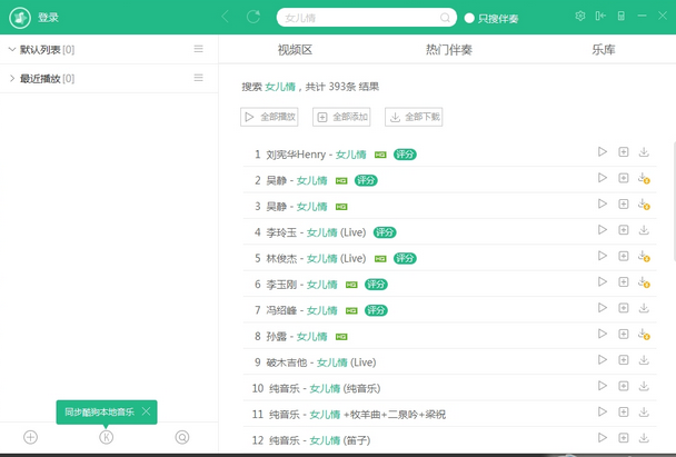 1、打開軟件后,在左側(cè)可以建立列表,右側(cè)音頻區(qū)或者頂部搜索自己喜歡的歌曲,如:女兒情,添加到列表,即可開始播放伴奏,這時(shí)候?qū)χ溈孙L(fēng)演唱即可。